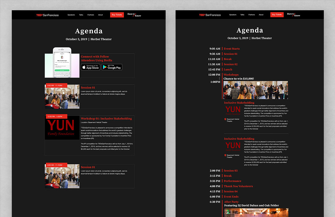 Iterations of the new agenda page for the event day
