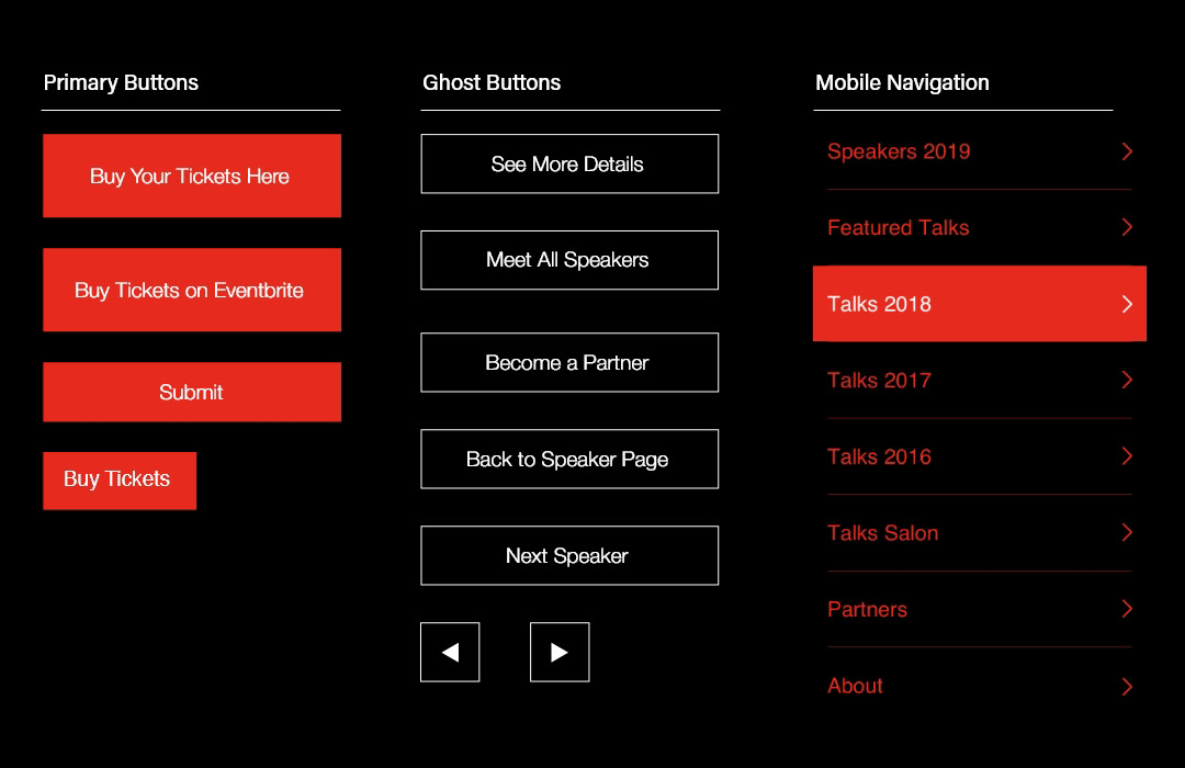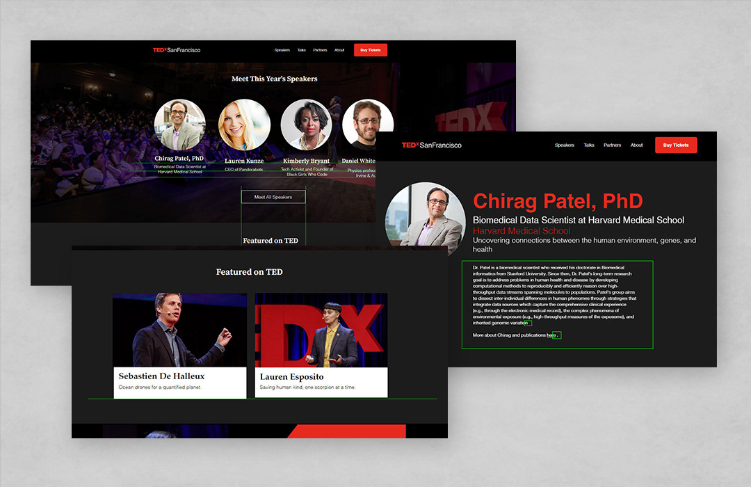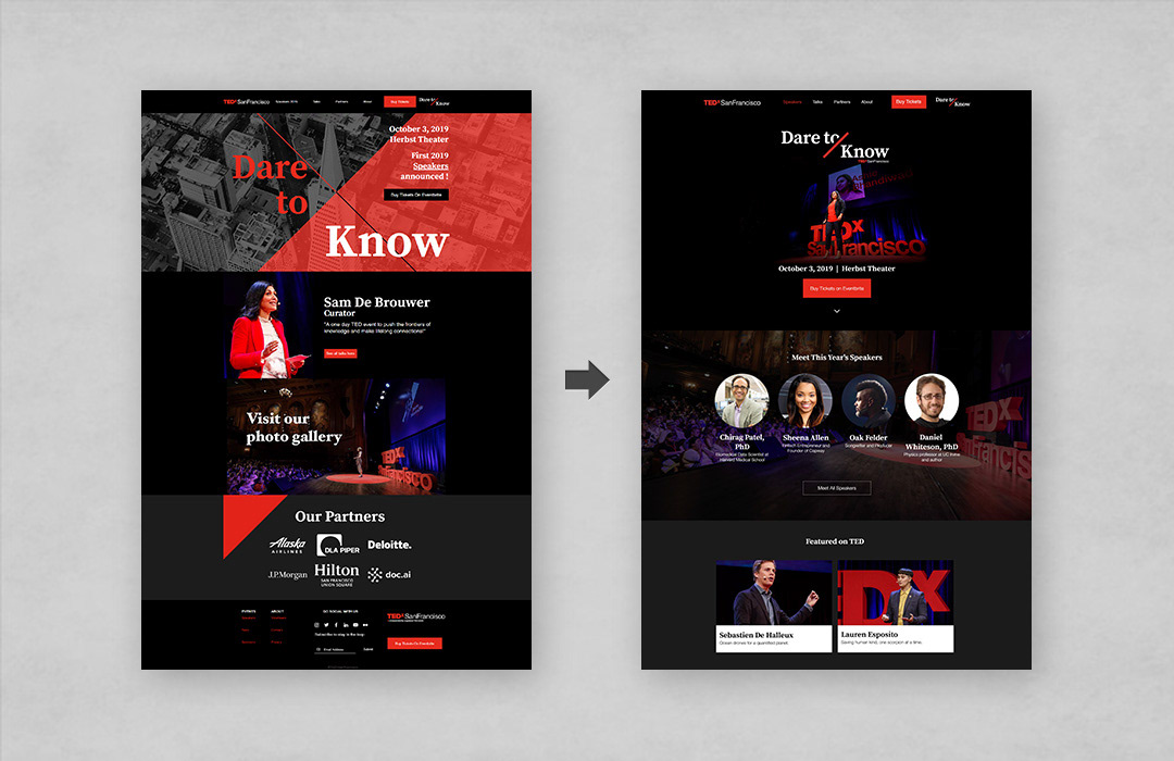 After discussing with stakeholders, our assumption was that the previous design simply was missing impactful content. The main sections did not feature any of the upcoming speakers, resulting in a lack of interest and poor conversion. In the redesign, featured speakers were shown as the first sections on the site for immediate exposure. Key highlights were added for featured subjects. Individual description pages were added to improve SEO results.