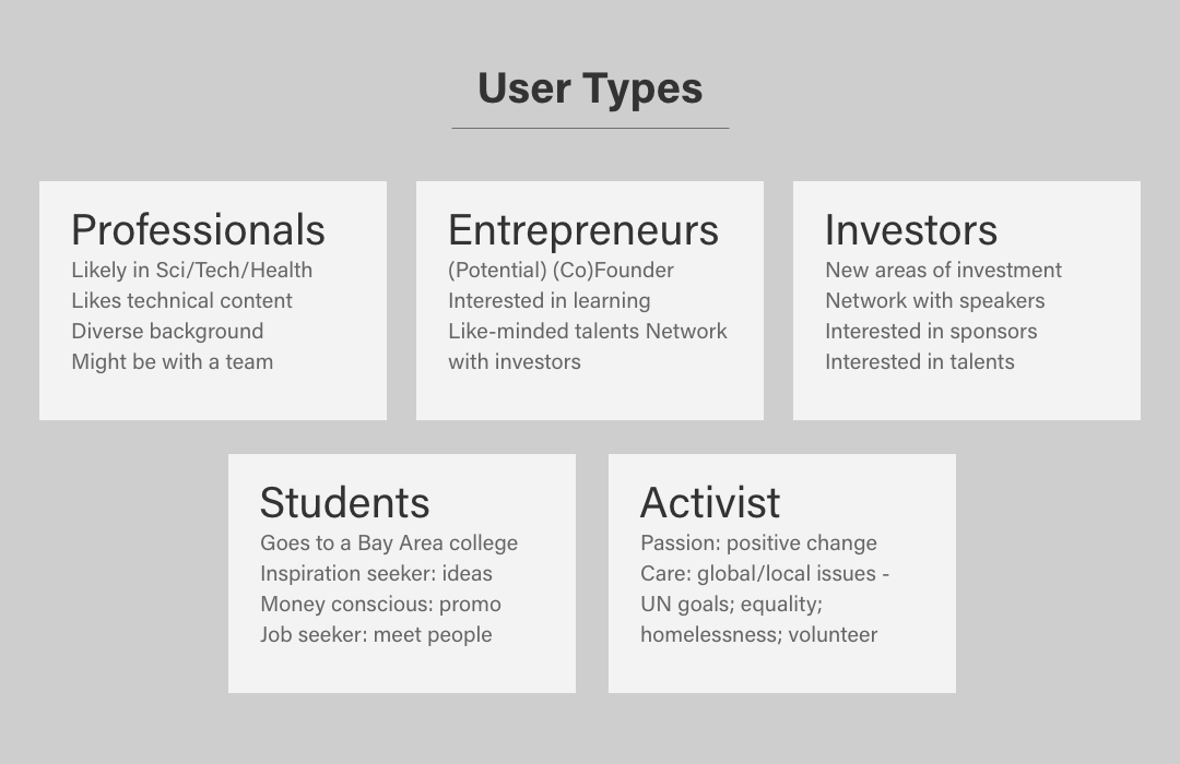 Target user profiles were built from ticket sales of previous events. This helped us define a direction of what users may be looking for, and structure the site's information architecture in a proper hierarchy.